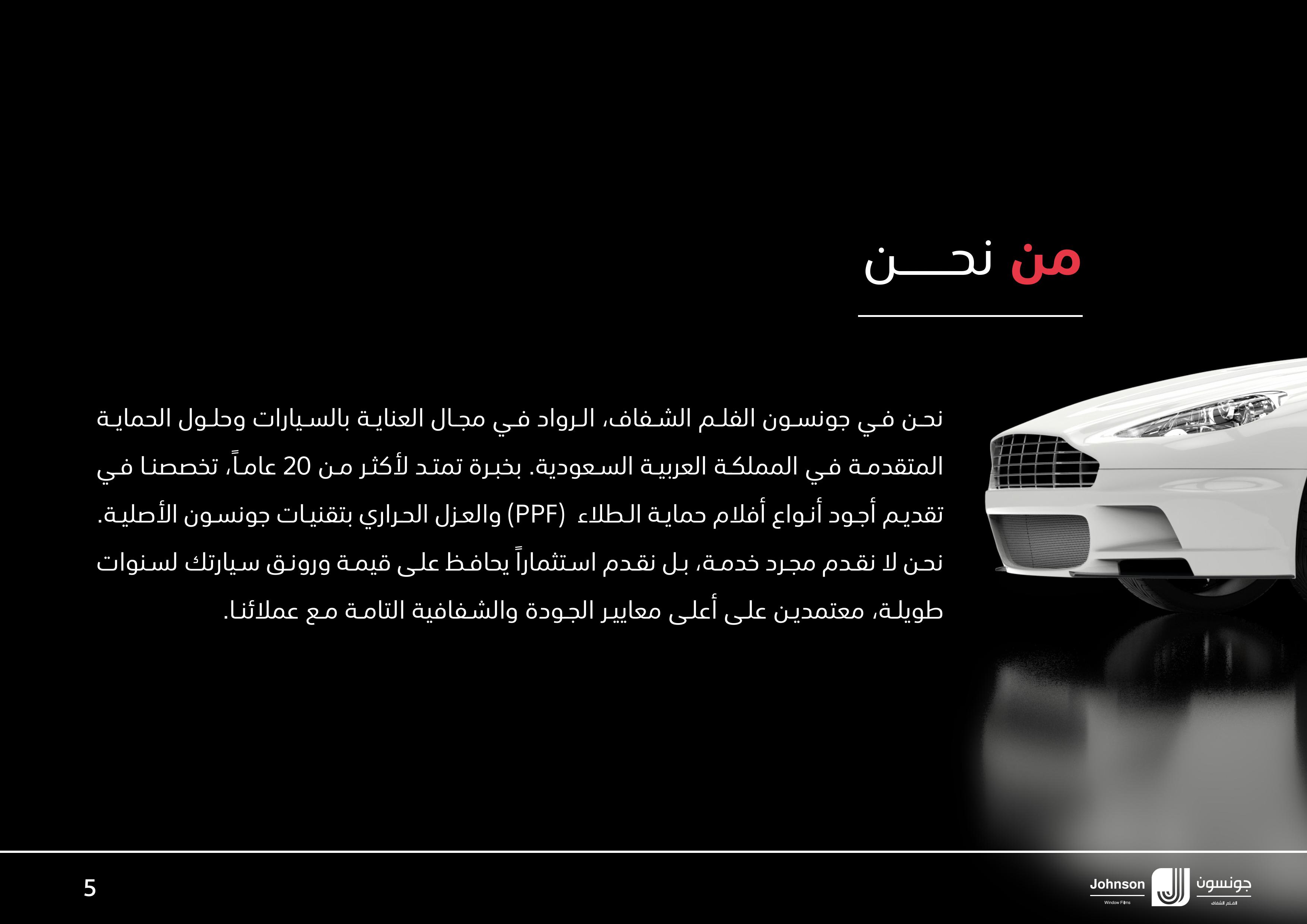 جونسون الاصلي الفلم الشفاف هو باختصار الخيار الوحيد لك في عامل العناية بالسيارات وافلام حماية PPF والعازل الحراري للسيارات الذي يمنحك الحماية، الثقة، والضمان الشامل في آن واحد.