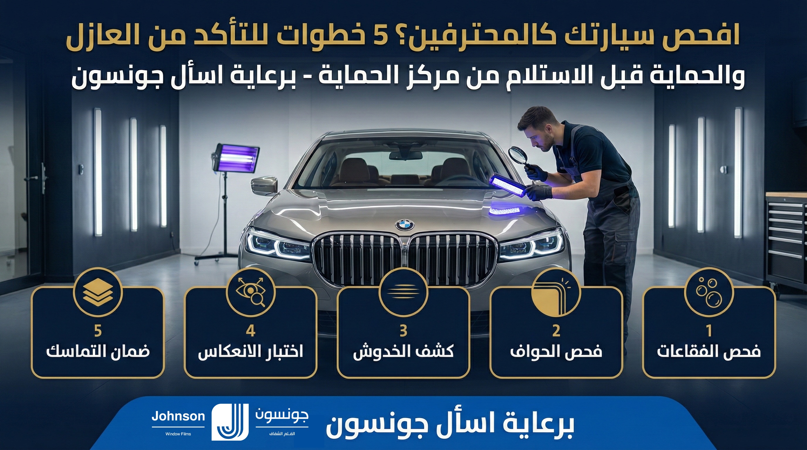 - الحل: التوجه لمركز جونسون لإزالة الفلم بتقنية البخار الآمنة، وتركيب فلم أصلي في غرف معزولة (Clean Room) لضمان التصاق مثالي.