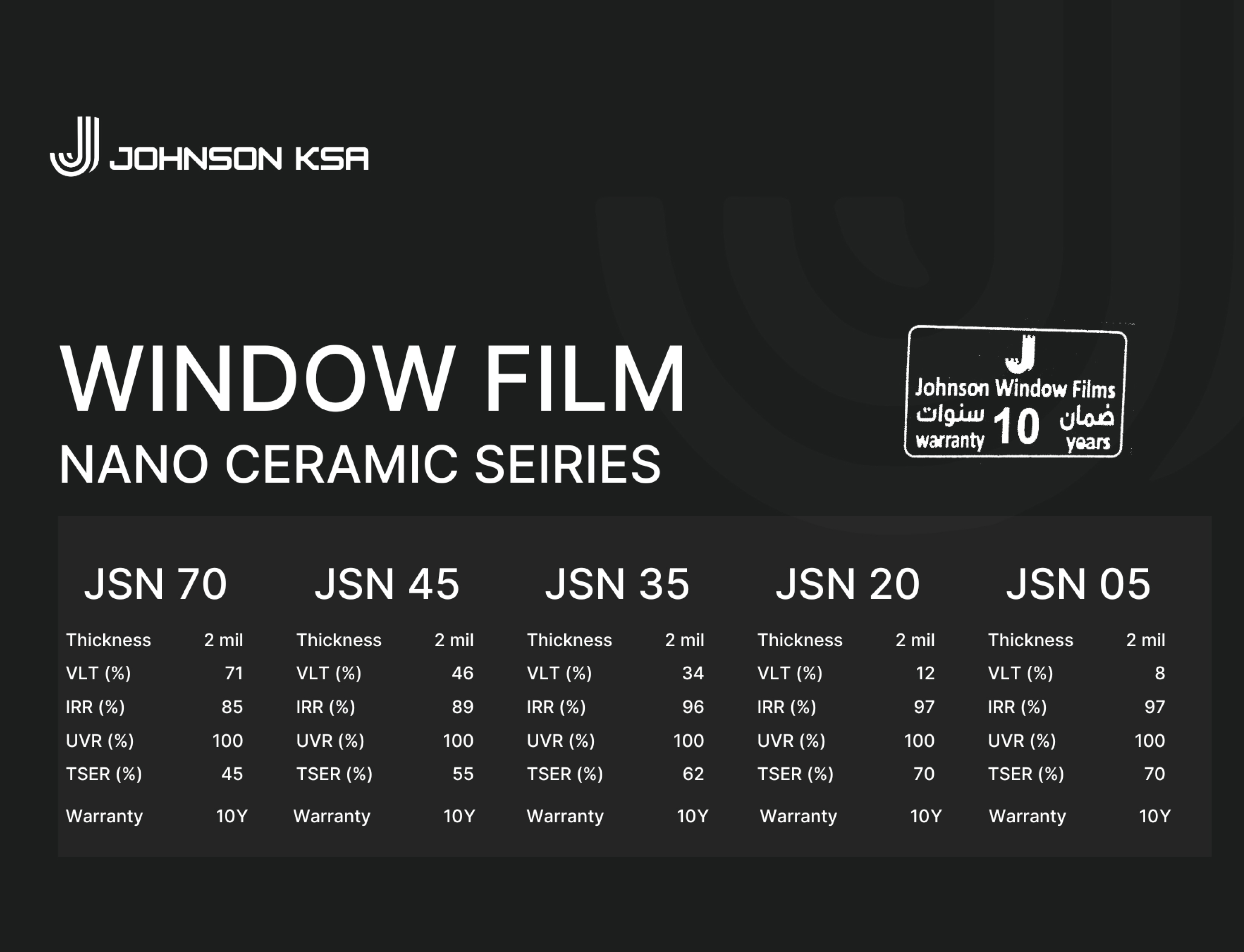 بناءً على البيانات التقنية لسلسلة "جونسون نانو سيراميك" (Johnson Nano Ceramic Series)، نحن نتحدث عن أرقام عزل جبارة تصل لـ 70% TSER، مع ضمان موثق يدوم لـ 10 سنوات كاملة.